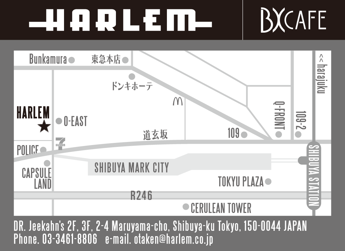 | ■PLACE DETAILS | BX CAFE (SHIBUYA HARLEM 3F) http://www.harlem.co.jp/access/access.html <アクセス> 渋谷駅ハチ公口より道玄坂を上がり、右手に回転寿司とファミリーマートのある道を右折。 |
